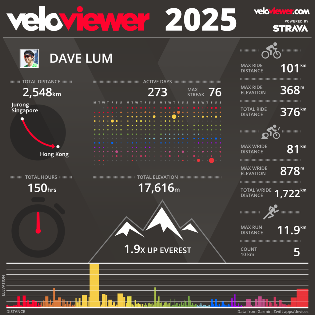 • Returned outdoors. 5x 10km runs is a massive improvement from my single 10km run in 2024. Also, finally got a round island (RI) done on the bike – a first for nearly two years. It was memorable. I tried for the first time and got a flat at Changi Coastal (construction debris everywhere). Discontinued the ride as my replacement inner tube had too short a valve. Tried again 3 days later and got a flat at Changi Coastal again. This time my CO2 canister failed but my wife rescued the ride by driving over a track pump. Finished the RI (100km) and felt good. Was somewhat worried that my lack of high volume cycling work would be an issue but didn’t feel much of a fitness drop. Guess the micro daily activities were adequately effective. (Also, no longer using CO2 canisters, swapping to a small electric pump.)